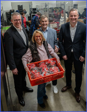 Die drei Volksbanker waren beeindruckt von den Aufgaben der Tafel mit ihren vielen ehrenamtlichen Mitarbeitenden und Monika Bartsch ihre weitere Unterstützung ankündigten. Sven Frauenkorn: „Es ist schön zu sehen, dass es so viele engagierte Helferinnen und Helfer gibt. Wir sind daher sicher auch im kommenden Jahr wieder hier.“